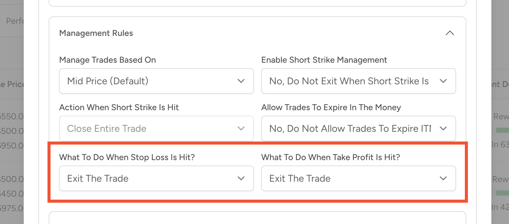 To change this setting, go to the Auto Trader page and click the gear icon in the top right corner. This opens the Options Bot settings popup. Under the Management Details section, you will see options for Action to take at take profit and Action to take at stop loss.